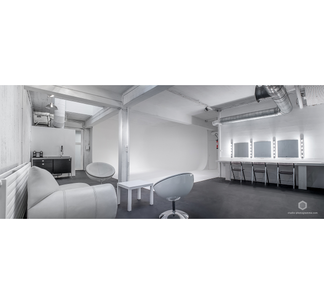Le Studio Photogramme dispose d'une cabine d’une douche, d'un espace maquillage, d'un espace cuisine et salon, le tout agencé autour des plateaux. Vous baignez dans un environnement de dédié à la création.
